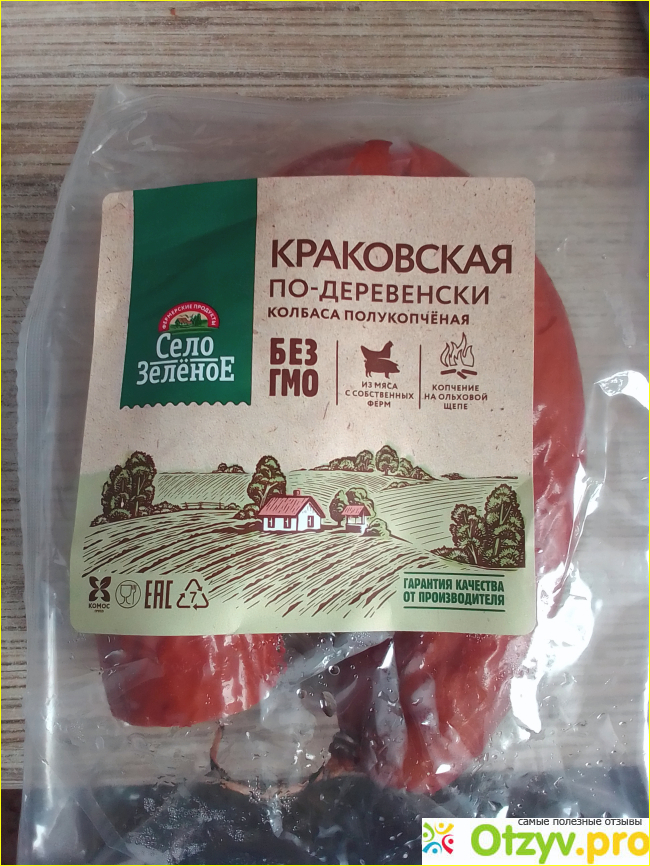 В очередной раз выбирая в продуктовом магазине колбасу обратила внимание на полукопченую Краковскую колбасу "Село зеленое" по-деревенски. Никогда не брала эту марку раньше, но привлек желтый ценник с весьма заманчивой скидкой при весе в 400 гр. Упакована в герметичную прозрачную полиэтиленовую упаковку, что позволяет рассмотреть продукт.