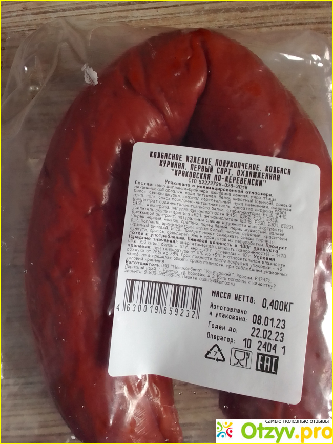 Внешний вид колбасы понравился- продукт блестящий, не мокрый, не липкий. Коптился на ольховой щепе. Правда смутило то , что на этикетке сзади указано, что колбаса куриная, но в состав входит и свинина. Конечно не обошлось и без добавок в виде различных консервантов, усилителей вкуса и загустителей.