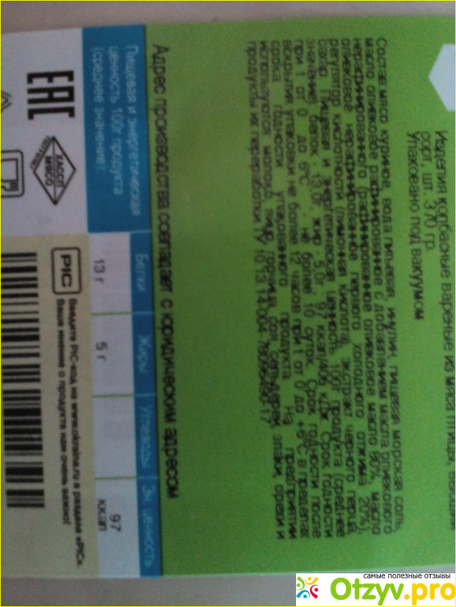 Когда привезли, подробно рассмотрела состав. Думала, что курица и обезжиренное молоко. Оказалось, что в составе действительно куриное мясо и оливковое масло, молока нет совсем. Понравилось то, что калорийность всего 97 на 100 грамм, меньше в колбасе я нигде не встречала. Жира всего 5 грамм на 100 и 13 грамм белка.
