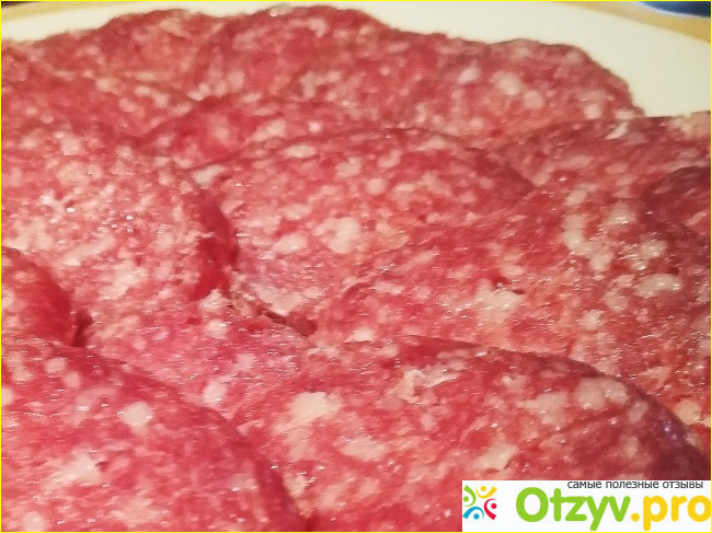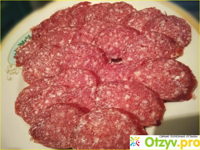 Колбаса в шкурке, которая легко снимается и мне чем-то напоминает бумагу. На воздухе эта шкурка грубеет. Цвет колбаски тёмно-красный с белым салом. Но она не жирная совершенно, больше даже сухая. И настолько твёрдая, что нарезать тоненько её не получилось. Резала с большим усилием. Может взять очень острый нож, как вариант.