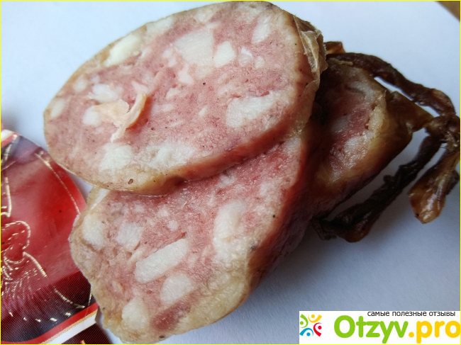 Пахнет дымком, словно её обжаривали на костре. Ароматизатор дыма, видимо, хороший попался. Поскольку придаёт продукту аппетитный аромат обугленного сала, но не мяса. Шкурка очень тонкая, почти как паутинка, снимается легко. Снаружи она светлого коричневого цвета с белыми зонами. Внутри колбаса блёкло-красная с большими кусками сала.