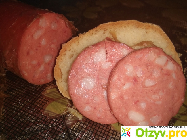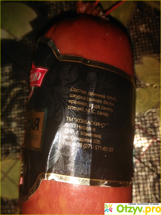 О ТМ "Ковбаскино" слышу впервые, на упаковке информации не так уж много ФЛП Нефедов. Расположены они в городе Макеевка - это наши соседи ДНР. Продукт розового цвета с крупным салом, самая обычная полукопченая, вкус сладковат (сахар в конце указан). Специи в норме. Плотность средняя, не расслаивается.
