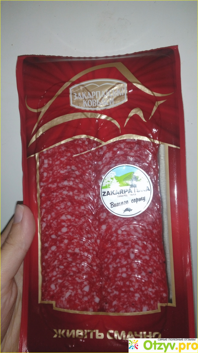 На этот раз я купила в дорогу уже готовую порезанную на тоненькие ломтики колбаску под названием "Закарпатская" от торговой марки Мир мяса.