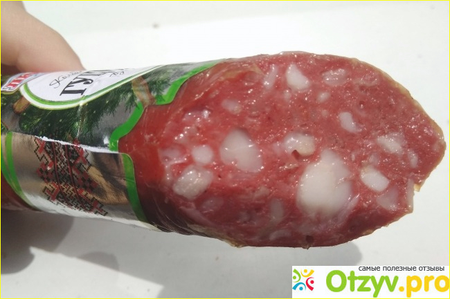 Цвет яркий. На ощупь очень жирная. По консистенции мягкая, немного плотнее жира. Как на жаре (только после покупки), так и из холодильника. Сало мелкое, подобное жиру, но есть и твёрдые крупинки. Сильно чувствуется перец, но даже не черные, а какой-то другой. Вкуса колбасы почти нет, один жир и перец. В общем, я ещё съела её нормально, а муж забраковал полностью.