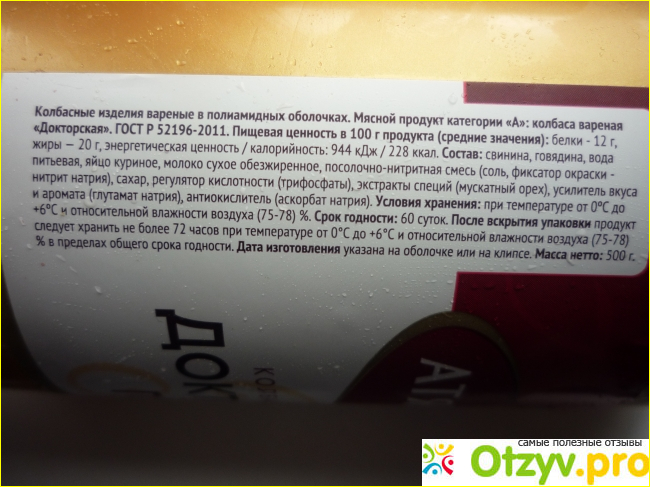 Колбаса изготовлена в искусственной оболочке, на которой размещена информация о составе продукта. Данная колбаса изготовлена по Стандарту, принятому в 2011 году. К сожалению, современные Стандарты отличаются от советских в худшую сторону. Они разрешают применять низкосортное мясо и различные добавки, которых не было в советских ГОСТах.