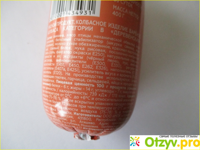 Категория "В" допускает содержание мяса в пределах от 40 до 60%. Остальное - наполнители. Здесь они указаны как рисовая мука и соевый белок. Кроме того - стандартный набор "Е-шек", красителей, стабилизаторов. Но без них колбасы вообще не бывает.