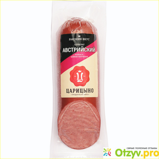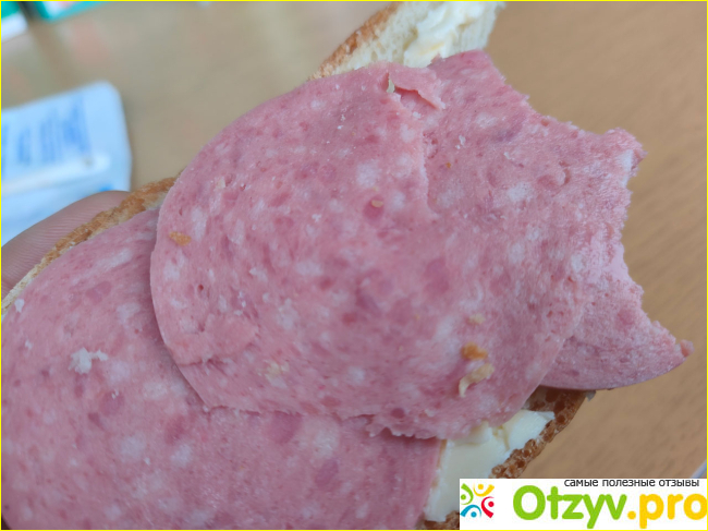 Колбасой нас угостили. Она насыщенного розового цвета с мелкими вкраплениями более тёмного и белого цвета.