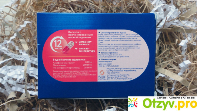 Здесь три активных вещества, которые вместе взаимодействуют и устраняют нежелательные симптомы: парацетамол, фенилэфрин, хлорфенамин. Выпускается препарат в форме капсул пролонгированного действия, относится к комбинированным средствам. Рассмотрим немного про каждый элемент: хлорфенамин оказывает гистаминное действие, устраняет слезотечение, зуд в глазах и носу, чихание, ощущение песка в глазах, покраснение конъюнктивы. Парацетамол хорошо известен как жаропонижающее средства, он обезболивает и уменьшает болевой синдром, который может наблюдаться во время респираторного заболевания. Часто во время болезни у человека бывают суставные или мышечные боли, ломота в теле, поэтому необходимо принимать парацетамол отдельно или Колдакт в частности. Более того, данное вещество всегда прописывают в качестве жаропонижающего средства как для детей, так и взрослым пациентам.