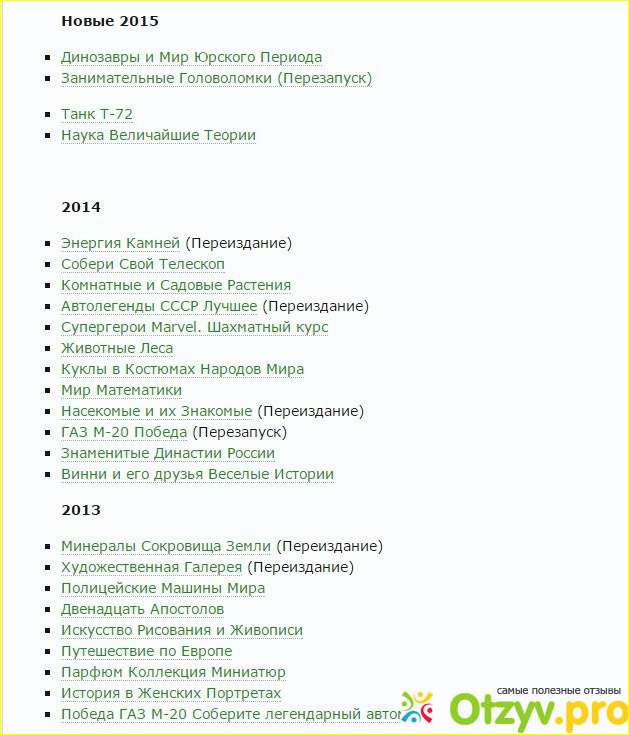 ДеАгостини (DeAgostini) - весьма плодовитое издательство, занимающееся выпуском журналов с коллекционными фигурками. Тематика их весьма разносторонняя. Привожу скрин с их сайта, где можно посмотреть список за последние пару лет: