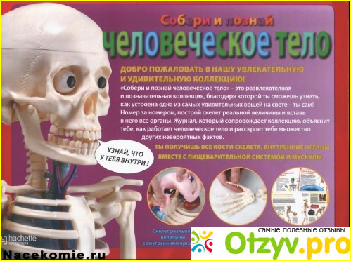 К журналам, посвященным строению человеческого тела, прилагаются части скелета и внутренние органа. Если запастись большим терпением ( а также энной суммой), в результате мы сможем собрать скелет по имени Артем. Поскольку журнал предназначен для детишек, то и скелет Артемка, соответственно, детский - ростом около 116 см. Честно скажу - собирать Артема очень увлекательно, но и очень затратно. На середине процесса мне надоело постоянно приобретать запчасти, и наш Артем одноног, как пират Сильвер. Кости довольно качественно сделаны и похожи на настоящие, внутренние органы напоминают дешевые пластмассовые погремушки, а вот кожа и мускулы уже вообще никуда не годятся ( в плане правдоподобия). Я их не покупала. Всего в серии Тело человека 82 выпуска, цена одного журнала 50 гривен. Путем несложных подсчетов можно определить, что скелет обойдется нам в более чем 4 тысячи гривен. Тогда как в интернете можно приобрести скелет за четверть этой суммы. Так что немного жалею, что повелась на это собирательство, но хоть ребено получил удовольствие.