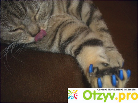 Одевать их конечно не сильно легко, одна бы я не справилась. Мы кошку заматывали в пеленку, оставляя одну лапку, муж держал, я стригла когти специальной когтерезкой (хорошо хоть тут был многолетний опыт подстригания когтей собакам, котам даже проще - у них коготь прозрачный и видно где сосуд кончается. на черных не прозрачный собачьих когтях куда сложней), и после стрижки одевала на клей колпачки. Держаться колпачки примерно 2-3 недели пока кошка их не снимет. Действительно классная вещь, ни мы, ни мы мебель поцарапаны не были. Кошка никаких не удобств не испытывает, не понимаю людей которые делают своим котам операцию "мягкие лапки", когда удаляют фаланги котопальчиков вместе когтями! Если так жалко мебель (я могу это понять) не надо заводить котов! Антицарапки - идеальный выход из положения, и животное не покалечено, и квартира не разгромлена.