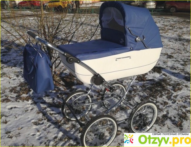 Другое позитивное отличие - на пластиковой коляске у нас садился конденсат, если из тепла в холод и обратно. С деревянным дном такой проблемы нет. Донышко не промерзало. Капюшон очень глубокий и хорошо прячет ребенка от непогоды. Вот действительно хорошо продуманная зимняя коляска. Очень большая сумка и большая корзина для покупок. Отлично подходит для мам "плюшкиных" и "кенгуру", которые все свое носят с собой. Я в эту сумку слингошарф складываю, если надо к бабушке на несколько дней вырваться, это вдобавок ко всем остальным ежедневным малышовым вещичкам. Стиль винтаж сейчас очень модный, а коляска при всем при этом очень практичная. Благодаря огромной люльке, в ней можно ездить и до 7/8 месяцев. Не все дети столько времени могут лежать в люльке, но если ваш таков, то вам не придется пересаживаться в прогулку только лишь на основании того, что люлька вам уже мала. Поэтому она очень подходит для деток рожденных весной, ихние 6/7 мес приходятся на холодное время года, когда нужно одеваться тепло.