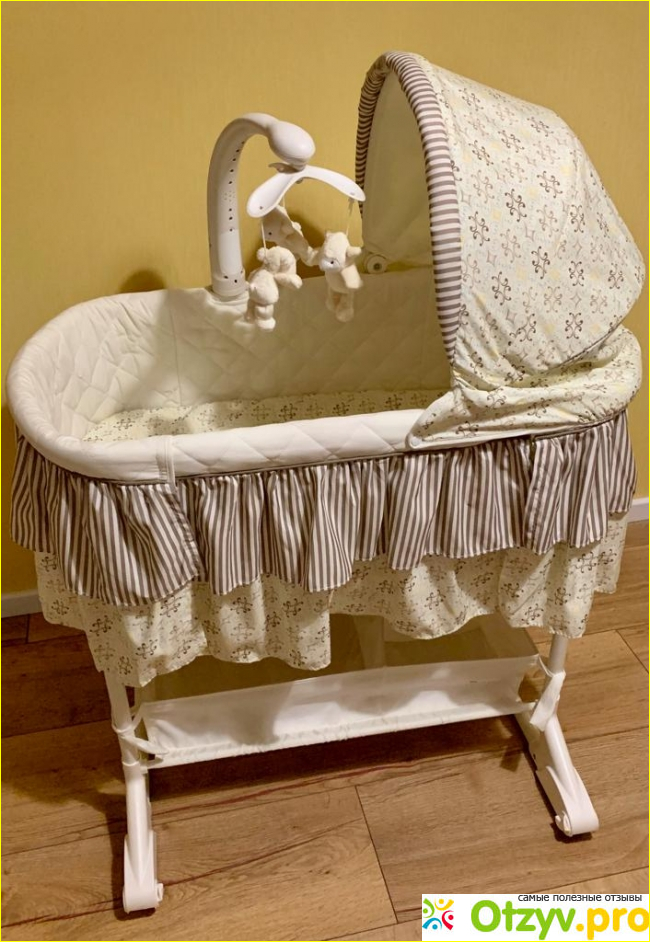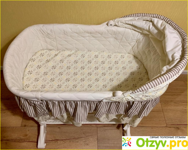 Пользоваться люлькой для новорожденных мы стали сразу же после выписки. Внутри колыбельки все обшито хлопком, ткань снимается и стирается. Капор (капюшон) у неё большой, меняет свое положение, причем, очень бесшумно. Снаружи люлька жетем свит дрим вся в красивых рюшечках, в общем, выглядит она очень симпатично и уютно.