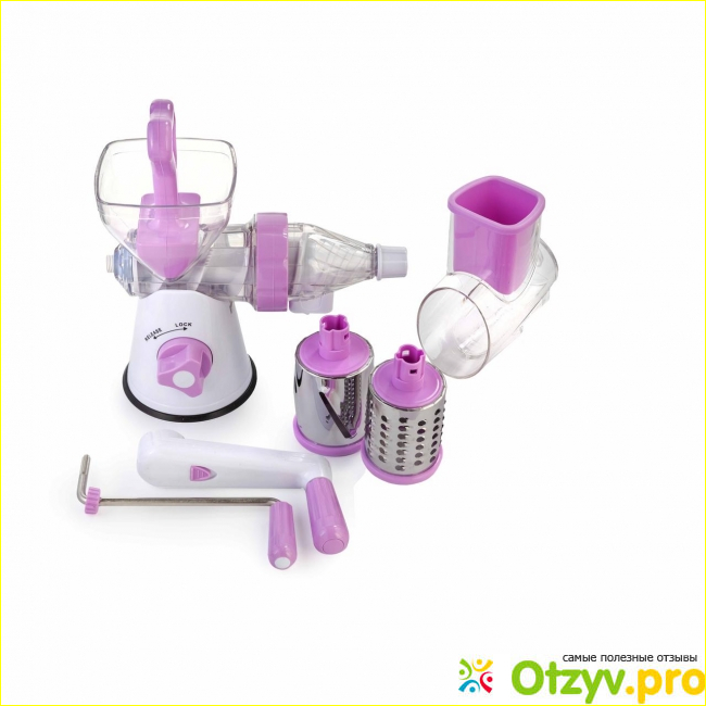 К основному корпусу комбайна крепится ручка. Благодаря ей вы будете без проблем перекручивать все продукты. которые будут попадать в лоток. И самым главным элементов в этой комбайне являются конечно же насадки. И их в этом наборе целых три. Первая насадка предназначена специально для приготовления соков. Причем с помощью этой насадки можно сделать сок не только из фруктов и овощей, но еще и из зелени. Если вы любите делать сок из проростков пшеницы, то данная насадка однозначно будет для вас полезной.