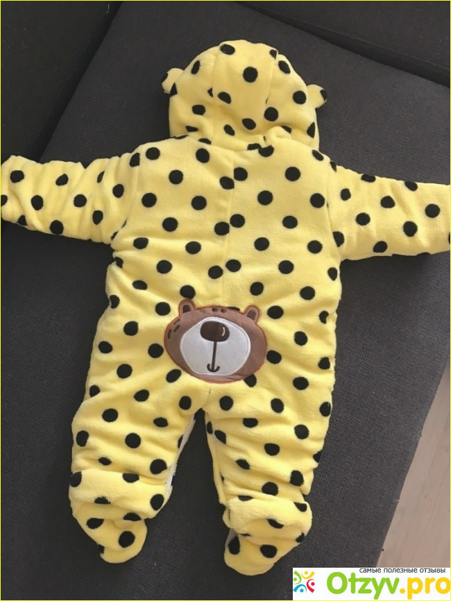 Цвет очень яркий. Сверху ткань - флис, утепление - синтепон и подкладка - хлопок. Аппликации в виде мишек пришиты на груди, на ступнях и на попке.