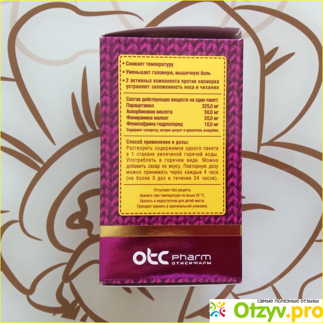 На упаковке есть ряд информации, с которой можно ознакомиться ещё при покупке данного противовирусного средства. Самая основная информация, а именно состав, содержание в нём парацетамола, правила применения, а также ожидаемое действие на организм. Расписано все подробно и доступным языком. Сразу хочу обратить внимание на состав, так как в нём содержится 325 мг парацетомола, что абсолютно не уступает подобным аналогичным средствам, но более дорогостоящим.