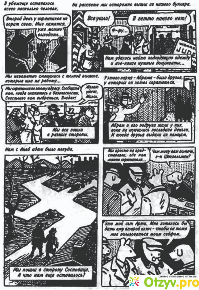 Во-первых, я ни в коем случае не являюсь антисемитом, мои лучшие друзья - евреи - тоже совершенно не уважают эту книгу, и вот почему (что я, что они, ее не любят по схожим причинам) - есть такой сатирический мультсериал "Американский папаша", в одной серии которого злодей (с пародией на бондиану и прочие "героические" фильмы о спецагентах) пытается утопить в слезах весь мир, демонстрируя фильм со всеми слезливыми штампами, какие только есть, а именно: еврейский маленький умственно отсталый мальчик, живущий в гетто времен нацистской оккупации Европы, которого еще и понимает только маленький друг-щеночек. Улыбнулись? Вот и я тоже. И если раньше быть еврейским писателем означало подвергаться гонениям, принимать все тычки и пинки жизни, оставаясь при этом подобно русскому писателю светло-грустным и смешливым сквозь слезы, и именно это добавляло уважения - то, что человек с тяжелой судьбой не жалуется, то теперь быть еврейским писателем - обычно сводится к тому, чтобы писать о Холокосте (даже если ты его вообще не застал), расковыривать свои моральные болячки перед всеми и обзывать фашистами тех, кого это достало. Самая посредственная форма и самый банальный сюжет теперь защищены от нападок критиков, стоит лишь сказать: "Ну и что, что это комикс, а не большая книга без картинок, ну и что, что это банально - уподоблять людей животным, ну и что, что это очередное пережевывание болезненной темы, но ведь это О СТРАДАНИЯХ ЕВРЕЙСКОГО НАРОДА ПРИ НАЦИЗМЕ!!!" И все, критик обмякает, боясь прослыть фашистом, нетолерантным и Бог знает кем еще.