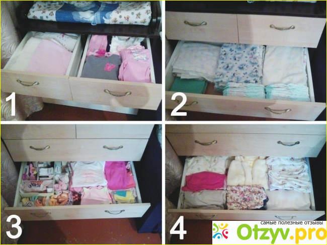 Смотрится комод достойно, вещи все удобно разместила. Правда, сначала аптечку положила в верхний ящик, но это оказалось неудобно. Когда ребенок лежит на столике, требовалось приподнять подвижную часть столешницы. Вобщем аптечку положила ниже (3 ящик), а в верхние полки положила полотенца и красивые наряды, платья (их не так часто берешь). Во втором ящике у меня пеленки, клеенки, подгузники, в третьем – аптечка, распашонки, бодики, носки, футболки, шапочки, в четвертом – теплая одежда, кофты, ползунки, штанишки, комбинезоны.