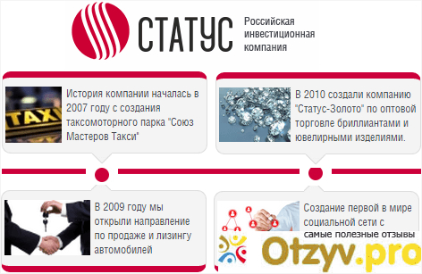 «Статус» является международным потребительским обществом, инвестиционной компанией, которая на рынке уже довольно длительный срок – около восьми лет, но тем не менее стала очень популярна и популярность ее только увеличивается. Рождение данной компании и датируется 2007 годом, когда было отмечено создание таксомоторного парка «Союза Мастеров такси». Сегодня этот бизнес вырос в достаточно известный холдинг, который смог обеспечить достаточный уровень стабильности всего бизнес-проекта.