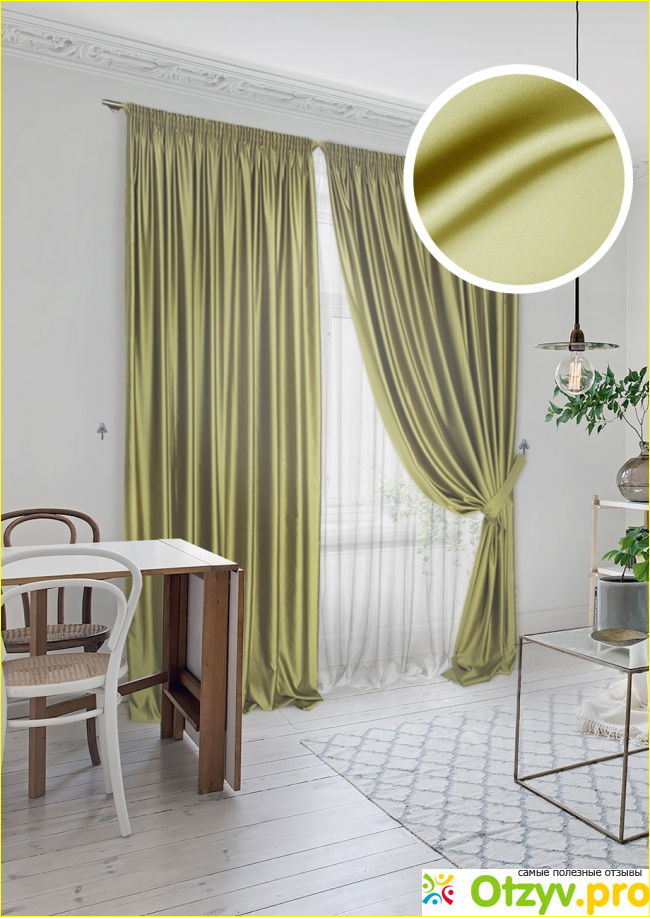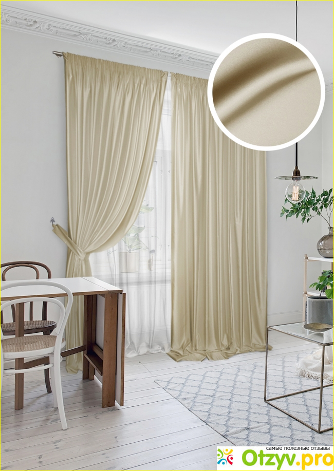 Шторы и тюль выполнены из 100% полиэстера: сатин и вуаль.