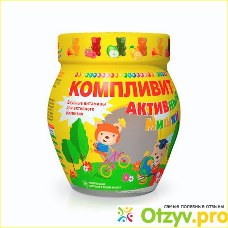 Витамины «Компливит» «Активные мишки» Изготовлены в форме желатиновых мишек весом в 4,5 грамма каждый, красного, оранжевого, желтого и зеленого цветов.