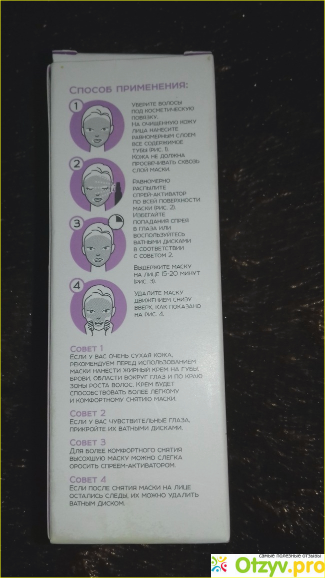 Я наношу содержимое тубы на лицо, толстым слоем, причем на шею мне не хватает. Затем прыскаю на маску спреем активатором (его нужно покупать отдельно) и оставляю маску на двадцать минут.