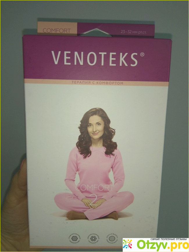 Зашла туда случайно, а там оказалось именно то, что надо. Девушка - продавец измерила мои ноги и принесла со склада коробочки с колготками. Выбрала марку VENOTEKS COMFORT. Производство Германия. Ещё в магазине я развернула посмотреть колготки, и меня приятно удивила мягкость трикотажа. Захотелось их сразу надеть. Оказалось, надевать компрессионный трикотаж надо с утра, как только встану с постели.