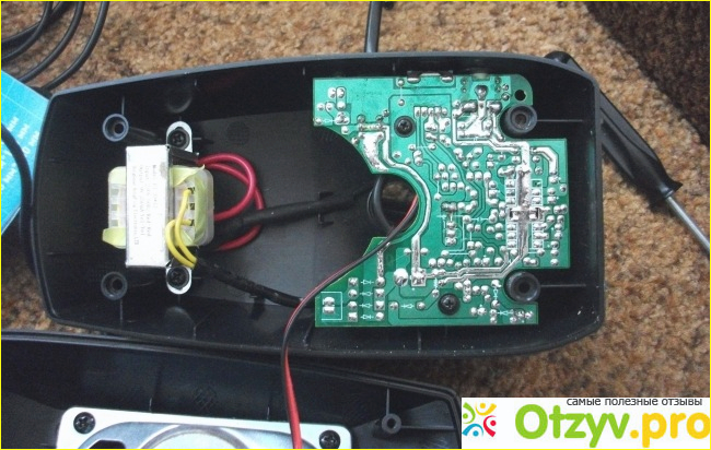 Слева виден силовой трансформатор, а сама "печатка" усилителя крепится 2-мя саморезами. Отвернем их и аккуратно отсоединим разъёмы, запомнив или записав, что куда идёт, чтобы не перепутать. Вот она: