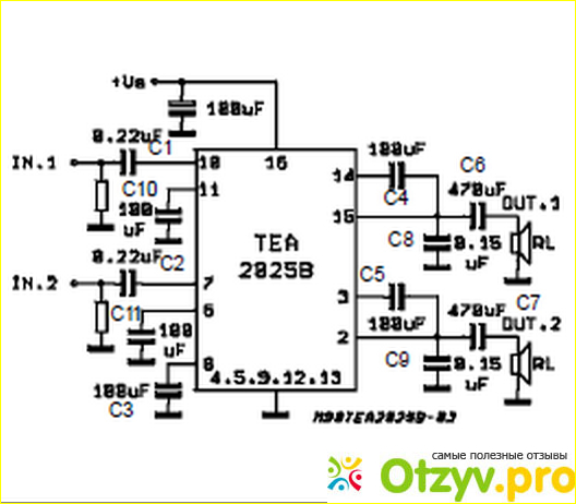 Внешний осмотр ни чего не дал. Видимо, придется повозиться с измерением режимов, и в первую очередь с проверкой ёмкости электролитических конденсаторов. Схемы с колонками нет. В таком случае я ищу даташит на микросхему. Здесь стоит "микруха" TEA 2025b. Вот типовая схема включения из даташита: