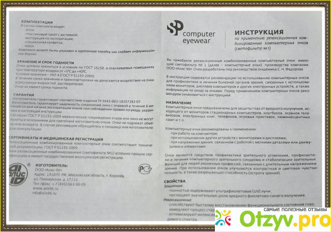Произведено это изделие в Российской Федерации, в городе Королёв, что в Московской области. Я всегда эти очки одеваю при работе в ноутбуке и смотрю в них телевизор. И действительно глаза стали меньше уставать. Дискомфорт исчез.