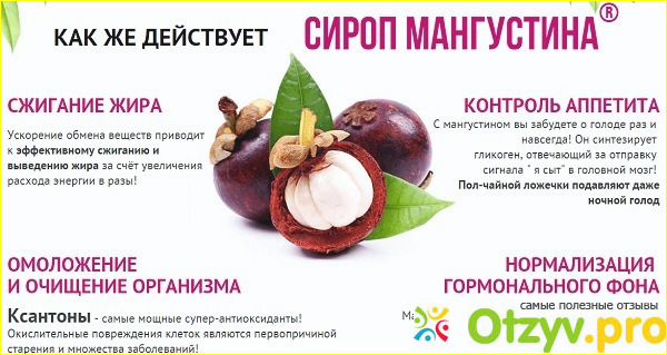 По идеи сироп мангустинов помогает сжигать жиры, уменьшает аппетит, ускоряет обмен веществ, тонизирует и наполняет энергией весь организм человека. Так что можно сказать о том, что сироп мангустинов в комплексе позитивно воздействует на работу нашего органима.