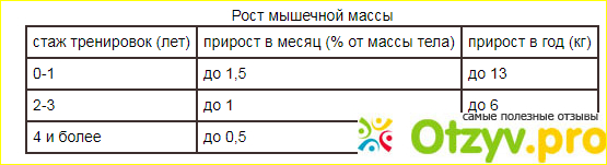 Кроме того, масса мышц, в принципе, увеличиваться быстро не в состоянии. На таблице мы можем видеть процент прироста. И это не мое личное мнение, а всемирно известных консультантов в вопросах бодибилдинга.