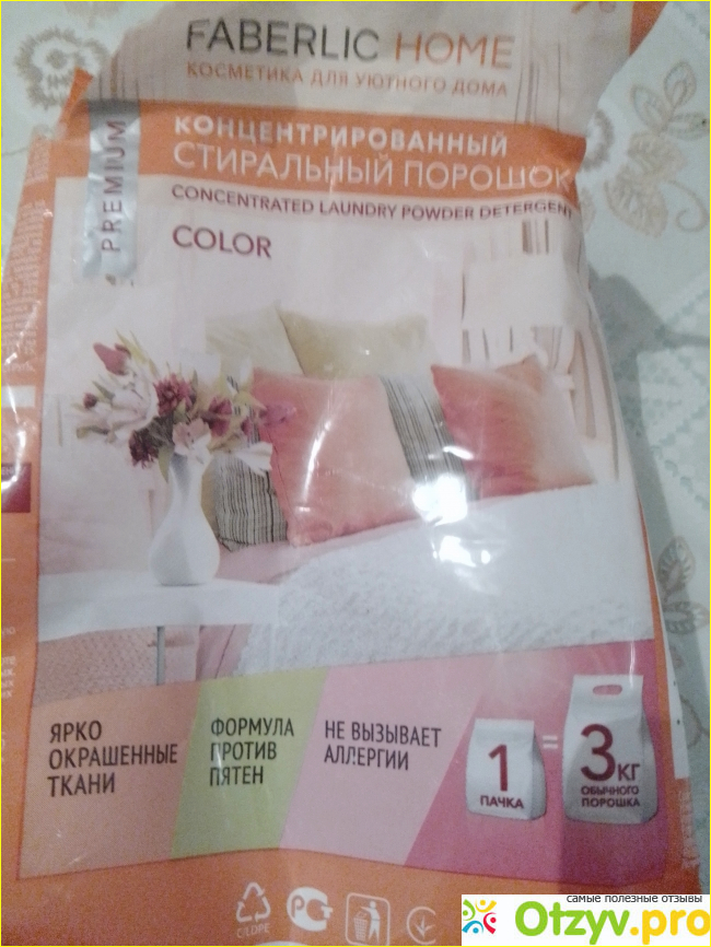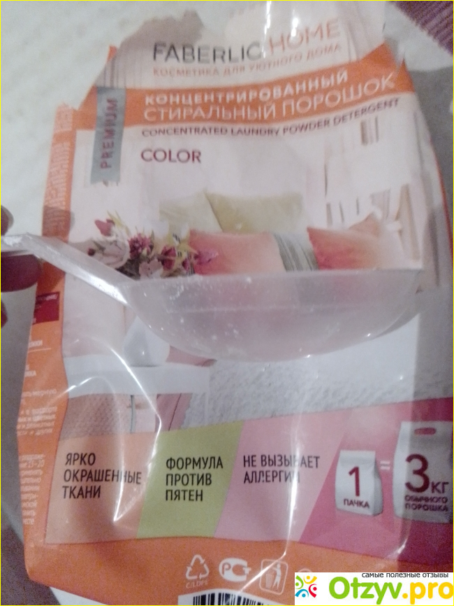 Недавно приобрела по скидке концентрированный порошок марки Faberlic, предназначенный для цветных вещей. Что сразу могу сказать: запах не приторный, приятный, в упаковке есть мерная ложечка, что очень удобно, засыпаю в машинку и стираем.