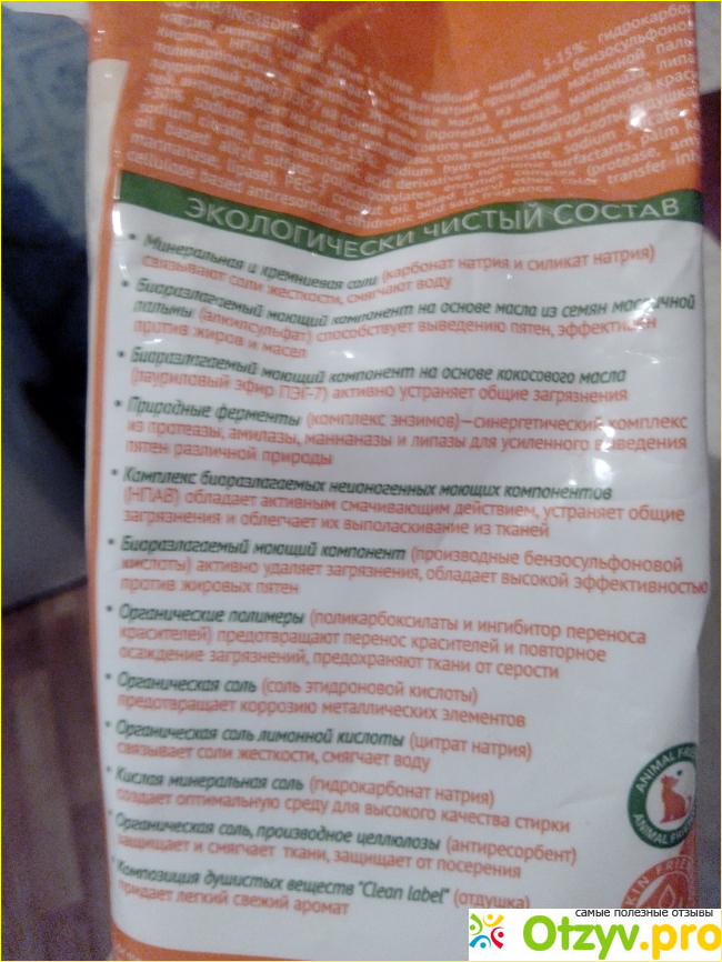 Состав тоже не вызывает аллергии, бесфосфатный, содержит природные ферменты, минеральные и кремневые соли, органические полимеры, соли, биоразлагаемый моющий компонент на основе масла из семян масличной пальмы и пр.