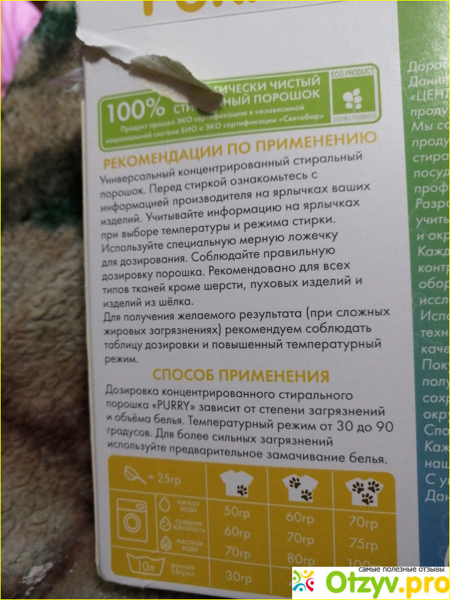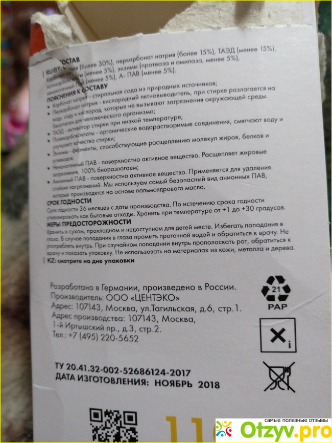 На коробке нам приводят очень много полезной информации о безопасности стирального порошка, разбор компонентов состава, как правильно пользоваться порошком при стирке в стиральной машинке.