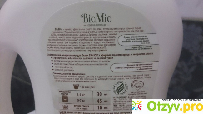 Итак, безопасный экологичный кондиционер для белья BioMio Bio-soft с эфирным маслом корицы и экстрактом хлопка. Упакован в белую бутылку с удобной ручкой, крышка отвинчивающаяся, под ней удобное горлышко-дозатор.