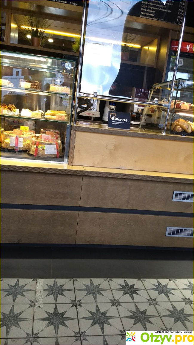 Одних наименований кофе несколько десятков, о некоторых из них я раньше даже и не слышала. Самый недорогой кофе без молока с сахаром в маленьком стаканчике можно купить за 16 гривен. Имеются в наличии и другие безалкогольные напитки: морс, чай, капуччино. Здесь есть различные тортики, пирожные, слойки и прочие сладости. В общем, вполне нормальное место для кратковременного перекуса и отдыха.