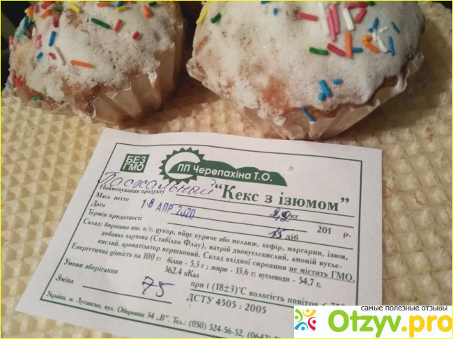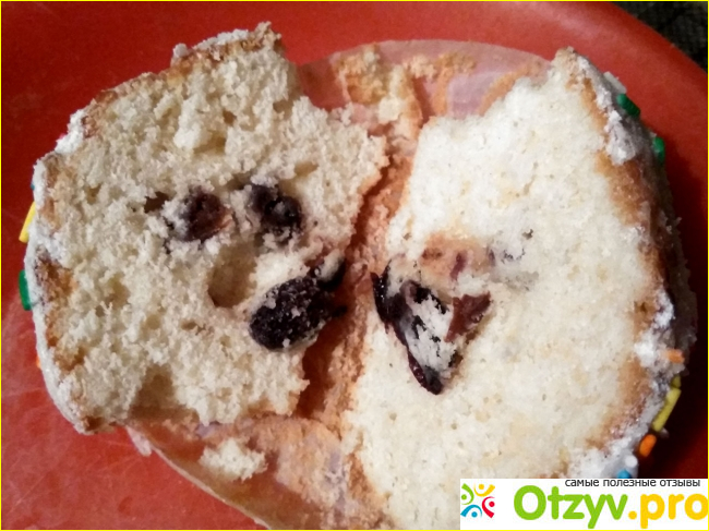 Изюм в центре собран. Он крупный, но мокрый и бесформенный, хотя вкусный. Бумажка мягкая, снимается легко. Посыпка съедобная, даже ложкой есть. В целом очень вкусно.