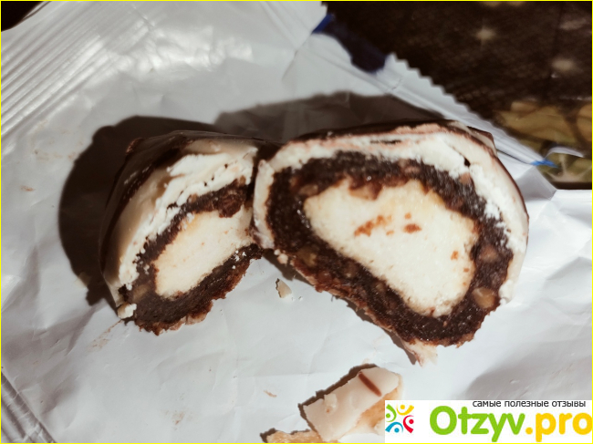 Слой чернослива занимает около 5мм. Внутри молочная паста мягкая и сладкая. В целом интересный дополняющий друг друга вкус.