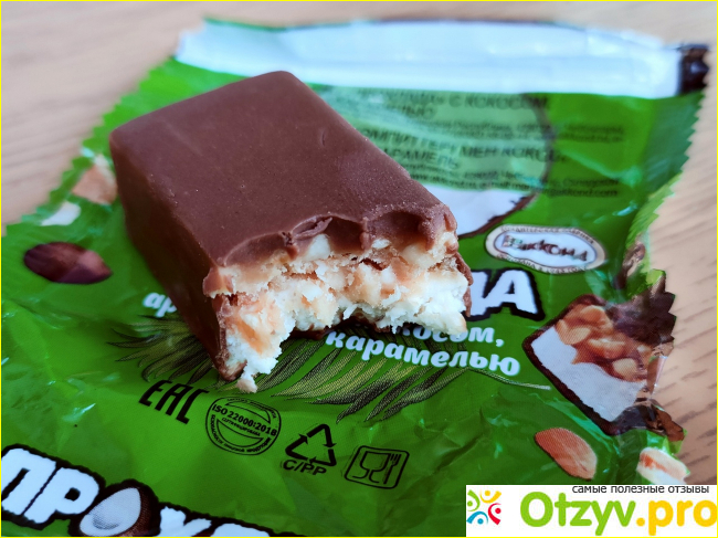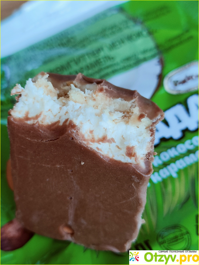 Конфета наполовину состоит из кокосовой нуги, сверху слой арахис в карамели. Полностью покрыта тонким слоем светлой глазури. Корпус мягкий, жевать легко даже орехи. Вкус их преобладает. Послевкусие карамельное. шоколад и кокос практически не ощущаю.
