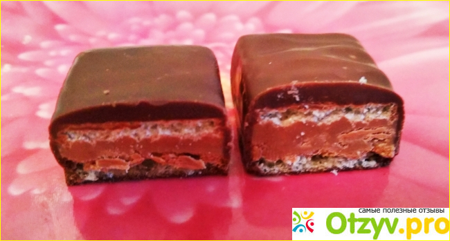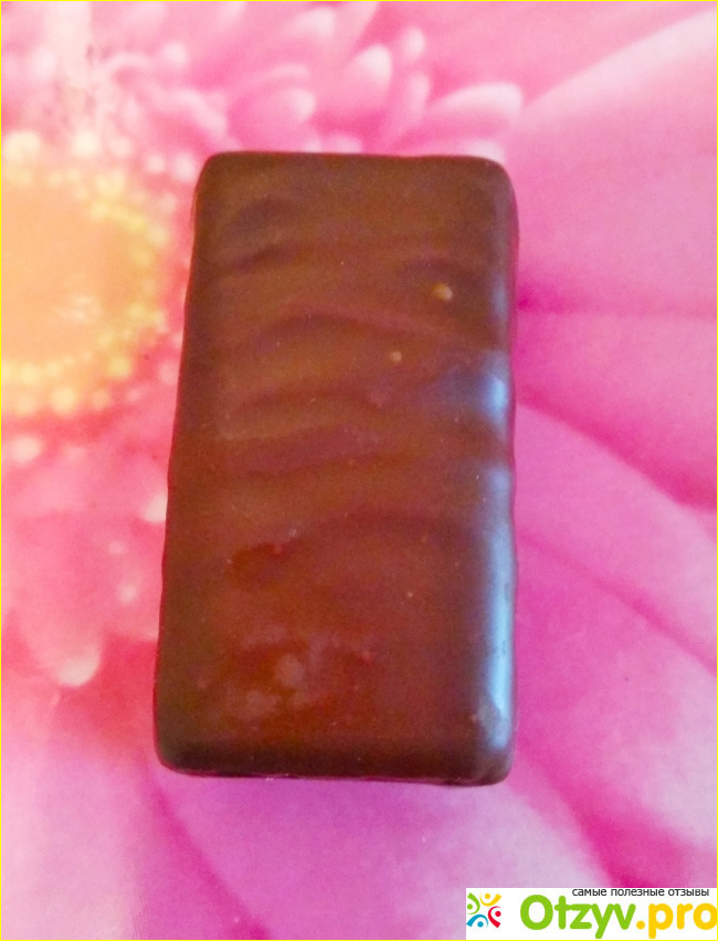 Сверху конфета покрыта шоколадной глазурью. Под глазурью вафельный слой с шоколадно-ореховой прослойкой.