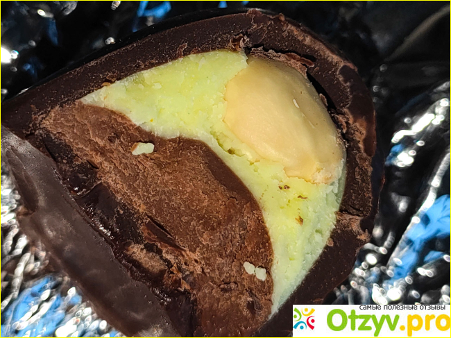 Но Папа Коля не удивил. Под слоем миллиметра в три вкусных шоколада кроется кремовая шоколадная начинка и зелёная фисташковая.