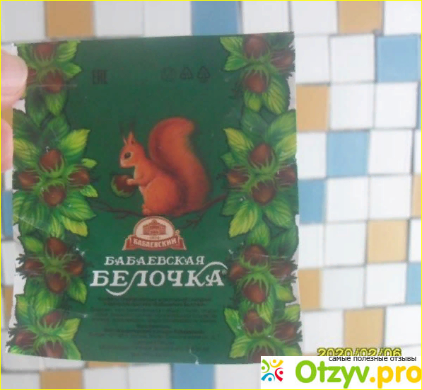 Рассмотрим конфету поближе. Она имеет темно-зеленый фантик, белочка как ни как в лесу живет. Здесь все понятно. Конфетная обертка плотная, но не имеет дополнительно внутри второй обертки.
