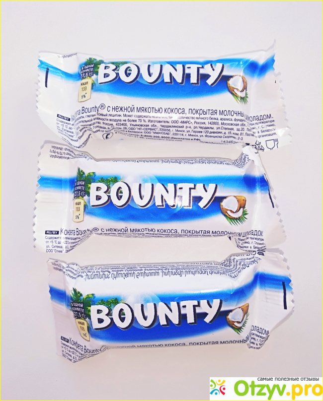 Конфеты Bounty, это тот же известный батончик Bounty, но в меньшем формате. Bounty я считаю одними из самых вкусных конфет с кокосовой начинкой. Существует множество других конфет, которые пытались сделать максимально похожими на эти, но всё же Bounty остаются одними из самых вкусных.