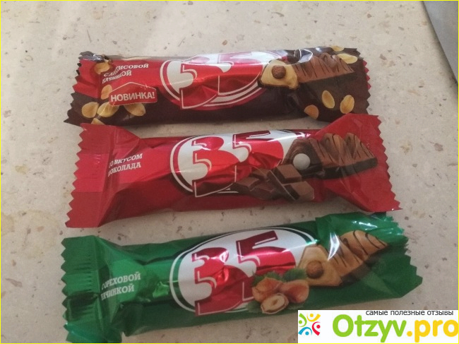 Вот такой вариант пробовала я, батончики "35" со сливочной начинкой и с шоколадной. С шоколадной - в красной упаковке, со сливочной - в сиреневой. У этой фирмы есть и другие варианты начинок батончиков, но я их не пробовала.