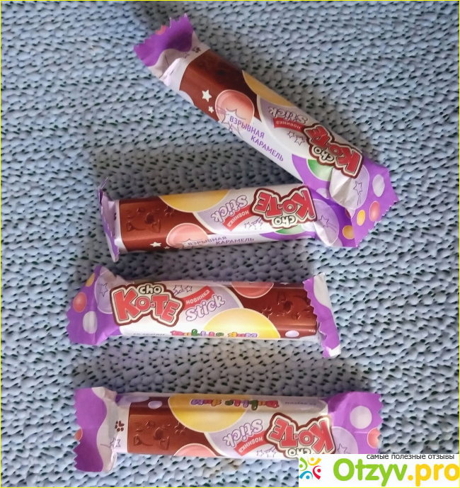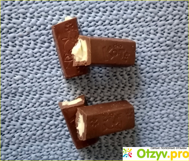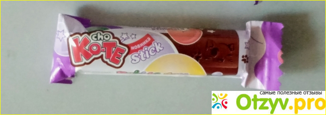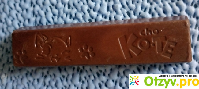 Сама конфета в виде продолговатого брусочка. Она тоже красиво оформлена. Тут есть и название, и изображение, мордочка кошки и следы лапок. С обратной стороны никаких изображений нет.