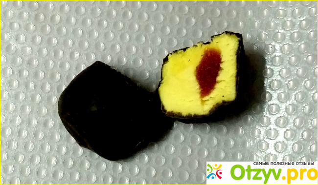 Начинка-лимонный конфитюр. На вкус -в меру кисленько. Конфеты мягкие, неплохие, можно их рекомендовать знакомым.