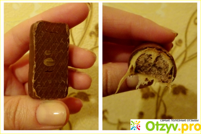 Великолепный, хрустящий вкус, тающий во рту. Она даже чем то напоминает всем известный батончик «Твикс». Как и все лакомства данный продукт достаточно калориен, в одной конфете содержится около 83 Ккал, но при это она абсолютно не приторная.