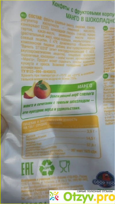 Сами конфеты упакованы вот в такой симпатичный фантик, сама конфета достаточно такая большая по граммам, манго залит шоколадом и от этого получается много.