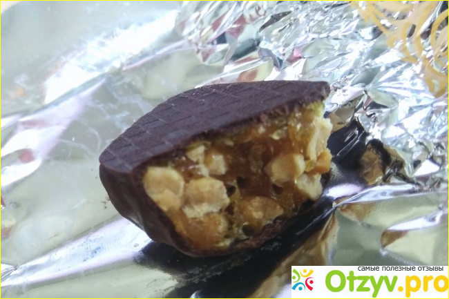 Конфеты заманчиво орешками пахнут. Глазурь понравилась, что редкость. Она немного горькая, вкусная, слой не тонкий. Но понимаешь это только обгрызая её. Пластинкой не отваливается. Во рту тает, не быстро.